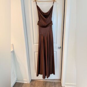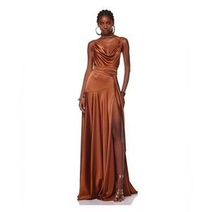 Turn heads in the Leo Maxi Gown, featuring a sleek cowl neckline and slender spaghetti straps in luxurious chocolate brown silk. Designed with an eye-catching asymmetrical waistline and a front leg slit for added allure, this gown is finished with a minimalist belt and an easy back zipper closureperfect for making a statement at any event.