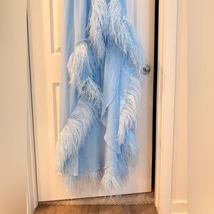 Stunning light blue gown with feathered details. Perfect for formal occasions.