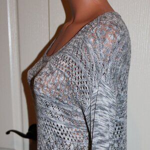 NEW! Size SMALL sweater from JEANS by BUFFALO - David Bitton. Pretty gray/white pointelle knit marled scoop neck sweater with delicate silver metallic threading woven throughout for a bit of SPARKLE & SHINE! Sweater falls slightly longer at rear with a loose, comfy and relaxed fit! SUPER SOFT & VERY LIGHT WEIGHT with STRETCH! Made of a Viscose/Polyester/Metallic blend.
