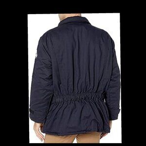 Bulwark new without tags fully lined quilted navy blue jacket size L Rg. 2 front pockets with velcro flap closer 1 chest front pocket with velcro closer.