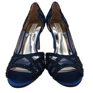 Keywords: Badgley Mischka Heels, Embellished Heels, Blue Satin Shoes, Women's Size 8.5, Beaded Heels, Luxury Footwear, Designer Shoes, High Heels, Evening Shoes, Special Occasion Footwear, Sophisticated Style, Fashionable Heels, NIB Shoes