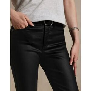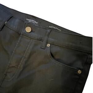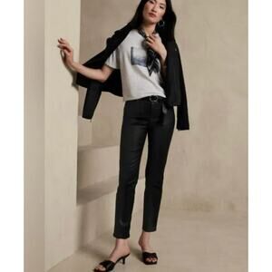 Banana Republic High Rise Straight Leg Ankle Jeans Coated Waxed Leather Looking Stretch Multi Button Solid Black, Raw Hem