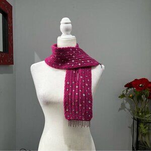 New Stunning Hand knit Cashmere Wrap Neck Scarf by Banana Republic features Shimmering Sequins and Beaded Iridescent Tassel Fringe. Comfy, Cozy, and Warm Winter Weather Scarf. One Size. Vivid Fuchsia. Pink Purple.