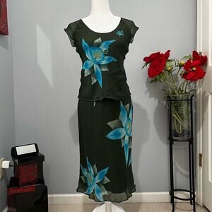 New without tags RARE HTF Stunning Banana Republic Semi Sheer 100% Silk Tropical Flowers Longline Midi Skirt and Scoop Neck Blouse with Ruffled Cap Sleeves, Ruched Side Seams, Tiered Side Hem and Semi Sheer Back and Sleeves. Longline Midi Skirt has an Elastic Waistband and Pull-On Styling. Gorgeous Dark Loden Green and Turquoise Blue Skirt and Blouse from the Banana Republic Summer 2002 Collection. Blouse is a Women’s Size XS and Skirt is a Women’s Size 4. Please See Approximate Measurements Provided Below.