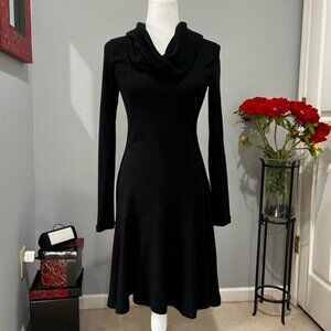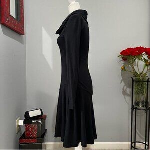 New without tags Wool Fit and Flare Long Sleeve Cowl Neck Classic Midi Sweater Dress by Banana Republic. Figure Flattering Tailoring. Bias Cut Detailing at Skirt at Lower Hip + Upper Thigh To Create Gorgeous Volume and Flounce Down to Calf at Dress Hem (Approximate and Based on Height). Some Stretch. Cozy Knit Mid Weight Fabric. Just add Tights! Black. From BR 2007 Holiday Line. Rare. Y2K. Size XS.