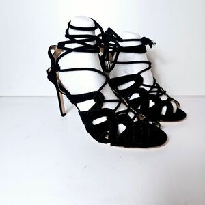 Elevate your style with these sophisticated black lace-up heels from Banana Republic. Featuring a sleek design with crisscrossing straps and a chic open-toe, these heels are perfect for adding a touch of elegance to any outfit. The lace-up detail provides a secure fit while enhancing the overall aesthetic.