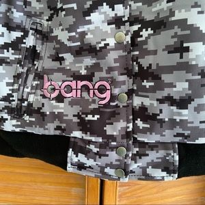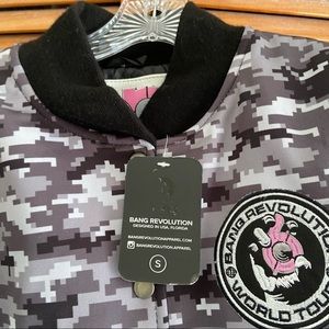 This limited-edition varsity style jacket is signed by CEO Jack Owoc, and comes with genuine leather sleeves, beautifully embroidered Bang logos combined with our cool RARE gray camo print with pink patches, making this jacket truly one of a kind.