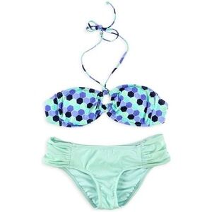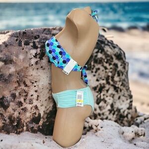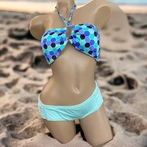 NEW Bar III Bikini Set 2 Piece Swimsuit Hexagon Print Halter Bandeau Top Aqua M