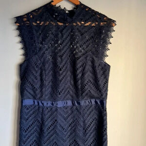 Color: Navy A flattering, body-skimming shape and scalloped lace left sheer at the hem make this dress a date-night winner. 44 1/2" length Exposed back-zip closure Mock neck Cap sleeves Lined 100% polyester Hand wash, line dry Imported