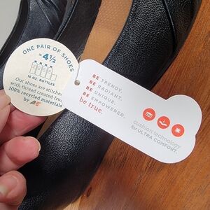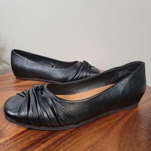 Black fats with a ruched and knotted style upper. Comfy, cushioned footbeds. Classic, versatile wardrobe staple. All manmade materials. Recycled materials used.