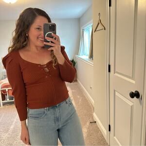I adore this new with tags designer Ba&sh orange red ribbed super sexy open front lace front puff sleeve top/sweater/pullover