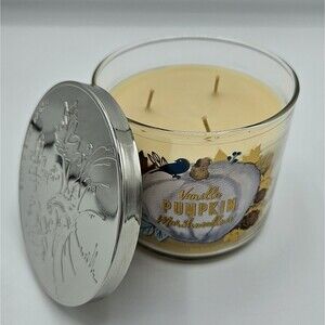 This new Bath & Body Works 3 Wick Candle in the scent of Vanilla Pumpkin Marshmallow is a large white jar candle made from a wax blend. The modern-style candle features a seasonal theme and multiple wicks, offering a burning time of up to 45 hours. Perfect for creating a cozy atmosphere in any home, this scented candle from Bath & Body Works is sure to fill the room with a delightful fragrance of vanilla and pumpkin marshmallow.