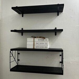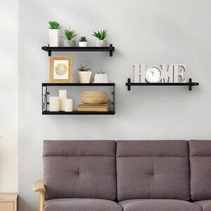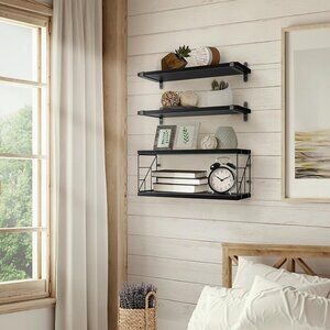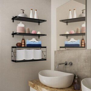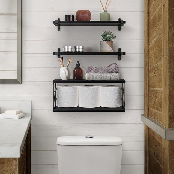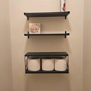 [Floating Shelves with Toilet Paper Basket]: Our floating shelf set is perfect for the bathroom. The set includes one 13.87 x 6 x 5 inch basket, which can store 3 rolls of toilet paper, towels, shampoo or other small items. The basket is made of iron wire with a powder-coated finish, which ensures that it will be durable and rust-free. 3 wooden shelves make full use of the wall, looking cute and useful.