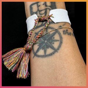 Spread a message of kindness everywhere you go with this beautiful and comfortable "Be Kind" hand-woven friendship-style bracelet. Rainbow letters on a white background really let the message stand out; adjustable rainbow braided tie with tassels at the end add a touch of Boho style.