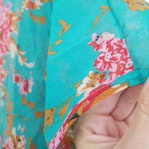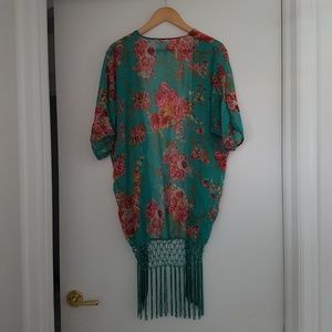Perfect length for a swim coverup measuring 41" long from shoulders to end of tassels. Brand new, tags removed and left a small hole. Hole pictured in last two photos. Hole located on back left sleeve at hem. Price reflects.