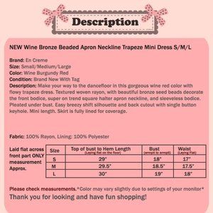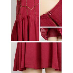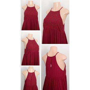 Make your way to the dance floor in this gorgeous wine red color with flowy trapeze dress. Textured woven rayon, with beautiful bronze seed beads decorate the front bodice, super on trend square halter apron neckline, and sleeveless bodice. Pleated under bust. Easy breezy shift silhouette and back cutout with single button keyhole. Mini length. Skirt is fully lined for coverage.