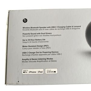 Beats Pill wireless Bluetooth speaker Matte Black, Removable carry lanyard, USB-C to USB-C cable for charging and audio, Quick Start Guide, Warranty card