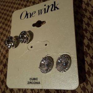 2 pairs of brand new earrings; 1 pair is genuine cubic zirconia (excellent quality) and the other pair are silver knots. They will never fade or tarnish and they will last forever. These are absolutely gorgeous earrings. Already discounted for being brand new. These are not dainty! Great quality cz medium oval stones w/smaller round cz accent stones. The clarity & cut really make these shine/sparkle. Pics dont dojustice. Paid 40$ for the set. Promise you'll love!