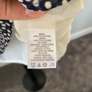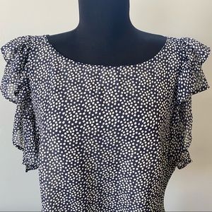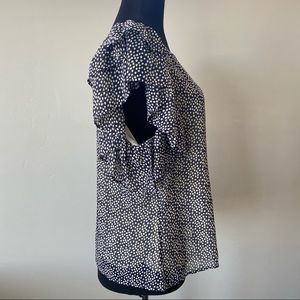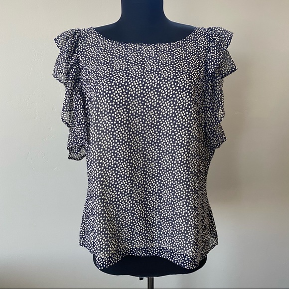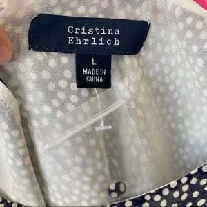 Cristina Ehrlich sleeveless blouse with tiered ruffles at shoulder. Navy blue with cream polka dots. Fully lined.