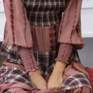 NWT! Tie dye and plaid tiered maxi dress with smocked bodice and long smocked bottom sleeves. This dress is absolutely gorgeous and is very high quality fabric. This has a back neck button closure. Beautiful smocked bodice in front. Long puff sleeves with elastic smocking at the bottom. This is a dusty rose color with tie dye effects with plaid tiers and a ruffled bottom. Very pretty for your holiday parties or a special date night. Cotton/poly blend fabric. Available in Women's size Small (4-6) Brand is ANGIE