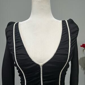 New without tags Gorgeous Two Tone Striped Black and White Ribbed Knit Plunge Neck Fitted Sweater Top by Bebe. Bodycon with Some Stretch. Long Sleeves. Ruched Bodice with Ribbed Hem. White Contrast Piping at Neck. Size Small.