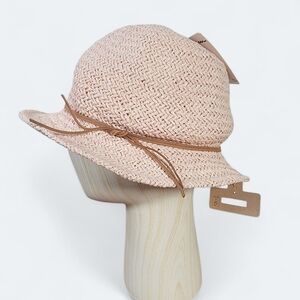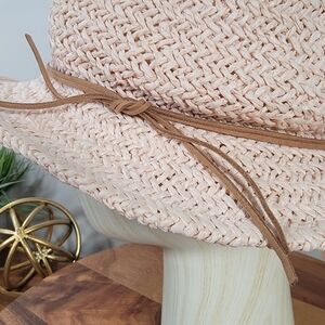 Chic pink straw hat with a decorative band. Perfect for sunny days. Tan tied trim. Lightweight.