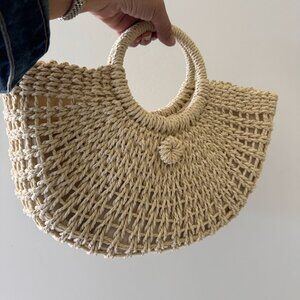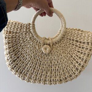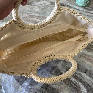 NEW Beige Bamboo Woven Semicircle Tote Handbag