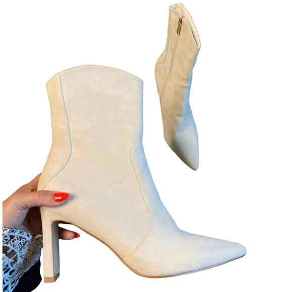A gorgeous stone/cream colored faux suede bootie by Bellini. "Lornie" bootie features a mid calf shaft and a comfortable 3.25" heel. Man made upper, lining, and sole. Size 9. New without box.