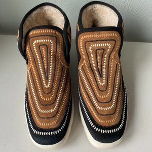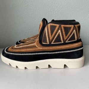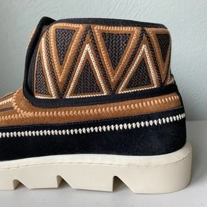 Cream soles, Black, Brown, Tan triangular geometric embroidered pattern.