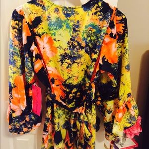 Colorful, summer Betsey Johnson blouse. Brand new, never been worn with tags. Very flattering cinching at the waist, ties in the back with boho bell sleeves. Super cute with white jeans.