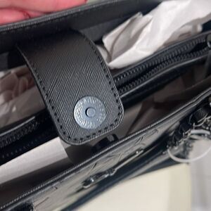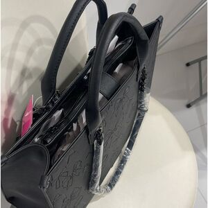 Elegant black tote bag featuring an embossed bow design. Comes with a matching pouch for added convenience. Perfect for any occasion.