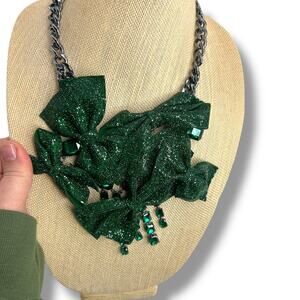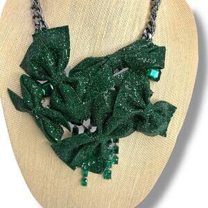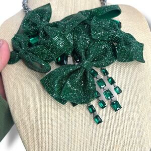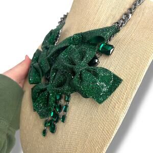 NEW Betsey Johnson Pave Bow Necklace Green Glitter Bows Dangle Choker Statement