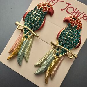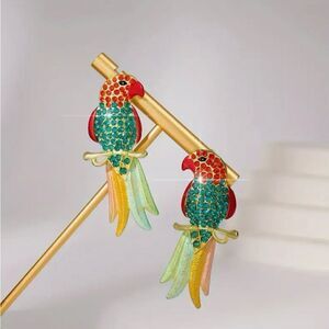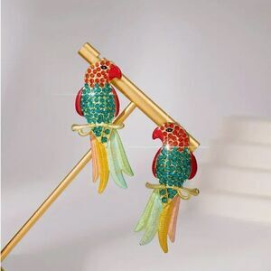 🦜 NEW Betsey Johnson stunning & colorful crystal embellished parrot earrings. Beautiful painted feathers with red and green crystals on the sweet parrot face. Beautiful details 🦜