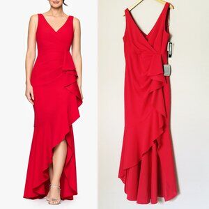 NEW Betsy Adam "Candace" Long V- Neck Hi Low Cascade Dress Red Size 14 USA $249