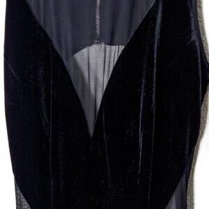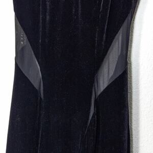 Betsy & Adam women’s gown in rich black sculpted velvet with a sheer panel bodice and mesh insets along the waist and neckline. Tagged size 2. This formal stretch gown is sleeveless, featuring a hidden zip closure at the back and a dramatic, full-length hemline. The silhouette is luxe and body-aware, designed to contour and highlight with elegance. The fabric has give but holds structure, allowing ease without sacrificing formality.