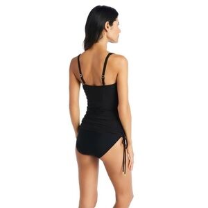 The Solid Essentials Draped V Neck Swim Dress Swimsuit features a shirred body for shaping and adjustable length with side drawstrings for a versatile look