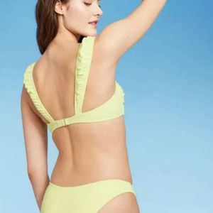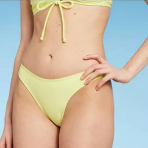Cheeky bikini bottom from Wild Fable in light yellow hue. Low-rise with high-leg design for a flattering silhouette. Made with soft and stretchy fabric with elastic at the leg openings. Pull-on style for easy on and off.