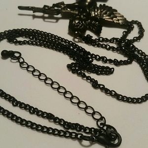 Brand New boutique necklace, black metal winged cherubic angel with a big machine gun pendant necklace. The baby angel is 2.5" wide by 2" tall, black metal with antique gold undertones, hung on a long 32" chain with a 2.5" extention, and lobster clasp closure. Done with 💘 love? It's the perfect sign ;)