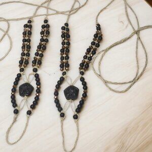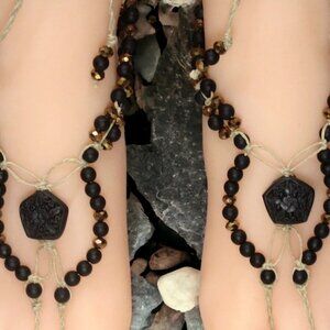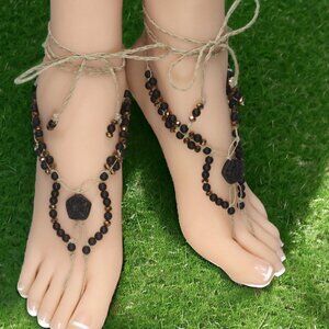 These handmade barefoot sandals are made from natural hemp knotted with black agate gemstone and copper metallic-plated stone beads. The centerpiece is a large acrylic bead. The toe strap and ankle ties are braided for extra durability. These sandals have 21-inch long ties with beads at the ends. The ties wrap around the ankle and can be adjusted to fit all adult sizes.