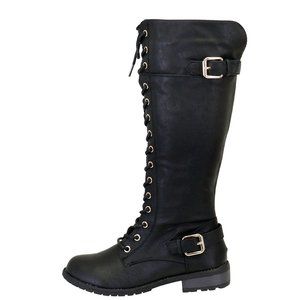 NEW Black Lace Up Military Combat Moto Boots Round Toe Knee High Low Block Heel
