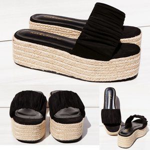 NEW Black Ruched Faux Suede Espadrille Slip On Slides Wedge Platform Sandal Shoe