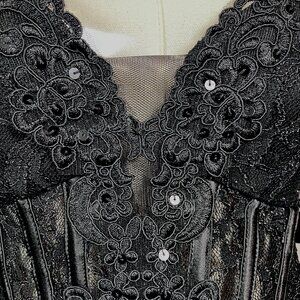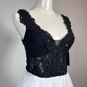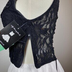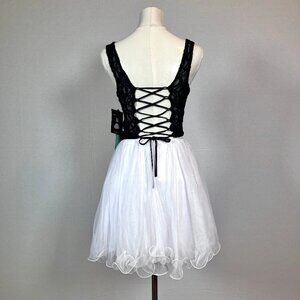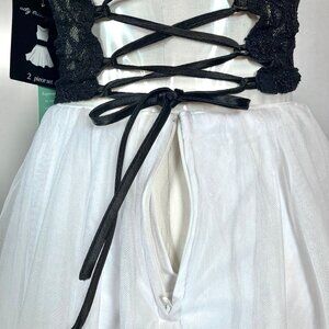 This stunning dress features a plunging V-neckline, a fitted bodice in rich black lace with scattered black sequins and zips and laces up in back. Paired with a flirty white skirt that falls around the knee depending on your height.