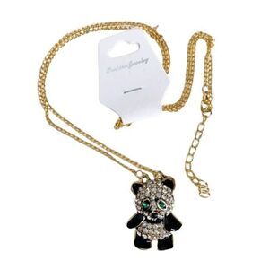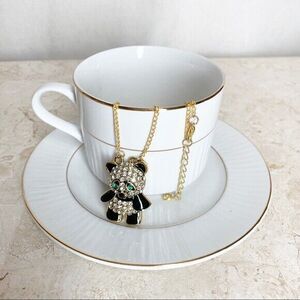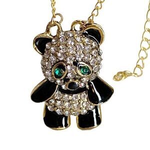 An adorable green eyed panda bear necklace! Pave clear/white rhinestones and black enamel all set in gold tone metal. About 1.5 tall by 1 wide. Gold tone chain is about 26 long with a 2 extender. New with tag!