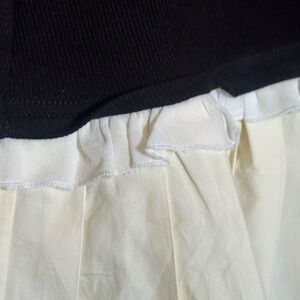 This chic blouse combines a sleek black body with a cream dress shirt collar and ruffled hem, creating a sophisticated and stylish look.