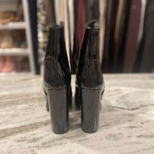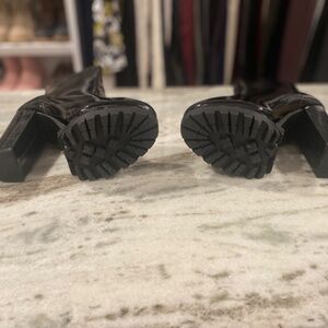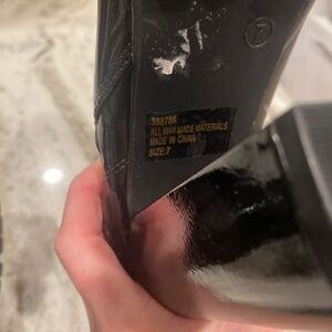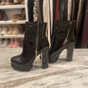 Brand new 5" heel black faux patent boots. These zip up for easy on/off. These can really dress up an outfit. I bought them and then never wore them. Very sturdy and the soles are rugged which is great for walking. These come from a smoke free and cat free home.