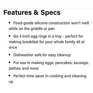 Get ready to elevate your breakfast game with this amazing Blackstone set! Included are six food-grade silicone egg rings and a Blackstone 350 recipe cookbook with tips and tricks. The egg tray is the new in the package and the cookbook has only been looked through once. Each egg tray ring is 4” across. Don't miss out on this fantastic opportunity to cook delicious meals and impress your friends and family! Happy cooking! This would also make a great “Thriftmas” gift!