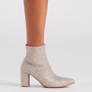 These gorgeous disco ready booties will take an y outfit you wear to the next level. Features a pointed-toe upper and sturdy block heel that fully decked out with sparkling rhinestones. Bring the party wherever you go in these showstoppers!!