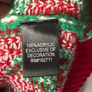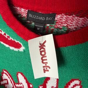 Festive Blizzard Bay men’s size M “GAINS Santa” ugly Christmas sweater featuring a muscular Santa graphic with barbell and sneaker pattern, knit in green/red 100% acrylic with crewneck, long sleeves and bold novelty holiday gym motif.