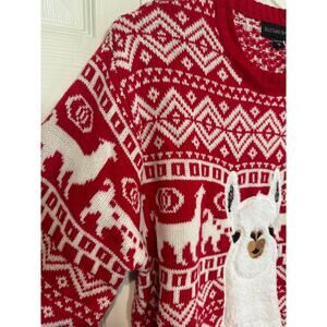 Embrace the festive spirit with this charming Blizzard Bay sweater, a delightful addition to your holiday wardrobe. Its vibrant red canvas bursts with a playful pattern of llamas and intricate geometric designs, creating a whimsical and eye-catching piece. The standout feature is the fluffy, three-dimensional llama adorned with a cozy striped scarf, inviting you to feel the warmth and joy of the season.