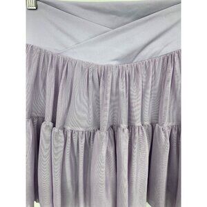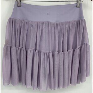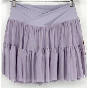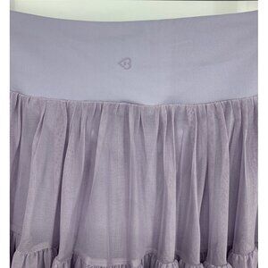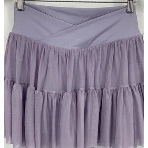 This is a women’s skort by Blogilates. This skort is a light purple color and has a stretch crossed waistband. This item has a tiered tulle skirt which overlays a pair of attached spandex style shorts. This item is new with tags.